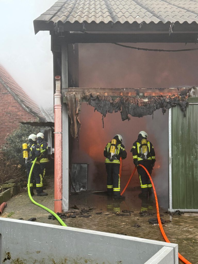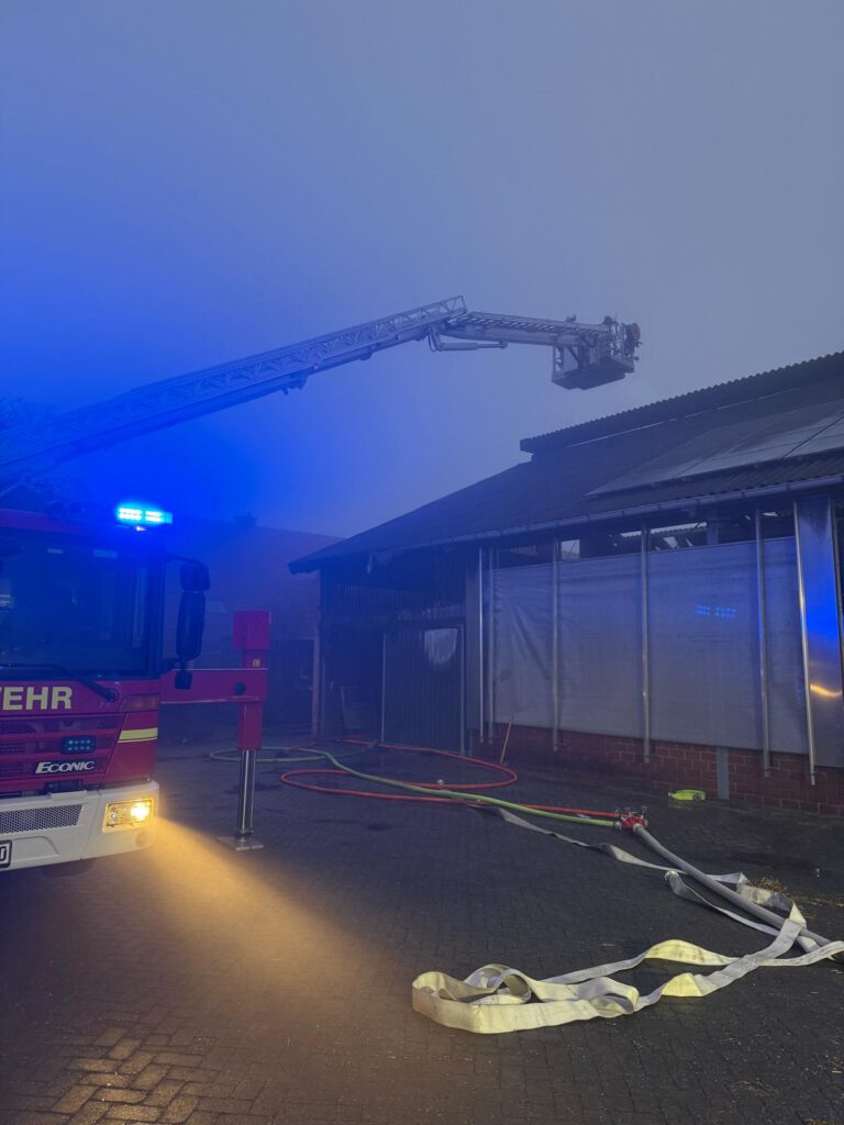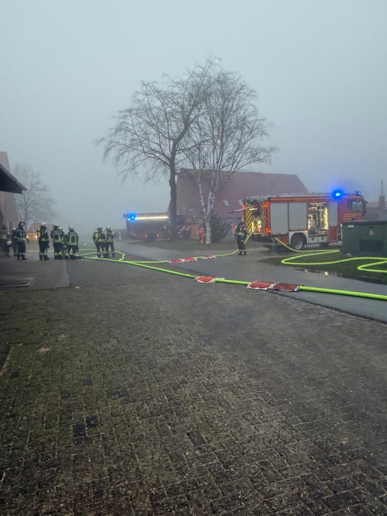 Unsere Einsatzkräfte rückten umgehend mit mehreren Fahrzeugen aus. Das ersteintreffende Löschfahrzeug fand den Stall bereits in Vollbrand vor. Das Feuer drohte auf angrenzende Anbauten wie das Wohnhaus, ein Strohlager sowie weitere Stallungen überzugreifen. Umgehend wurde ein umfassender Löschangriff eingeleitet. Zu Beginn des Einsatzes gestaltete sich die Wasserversorgung schwierig. Aus diesem beiden Gründen wurde das Stichwort auf F4 – Gebäude erhöht wurde. Infolgedessen wurden auch die Feuerwehren Veldhausen und Georgsdorf alarmiert. Zusätzlich wurden die Brandweer Ootmarsum sowie der HRB aus Nordhorn nachgefordert. Ebenfalls eilte der Kreisbrandmeister zur Einsatzstelle.