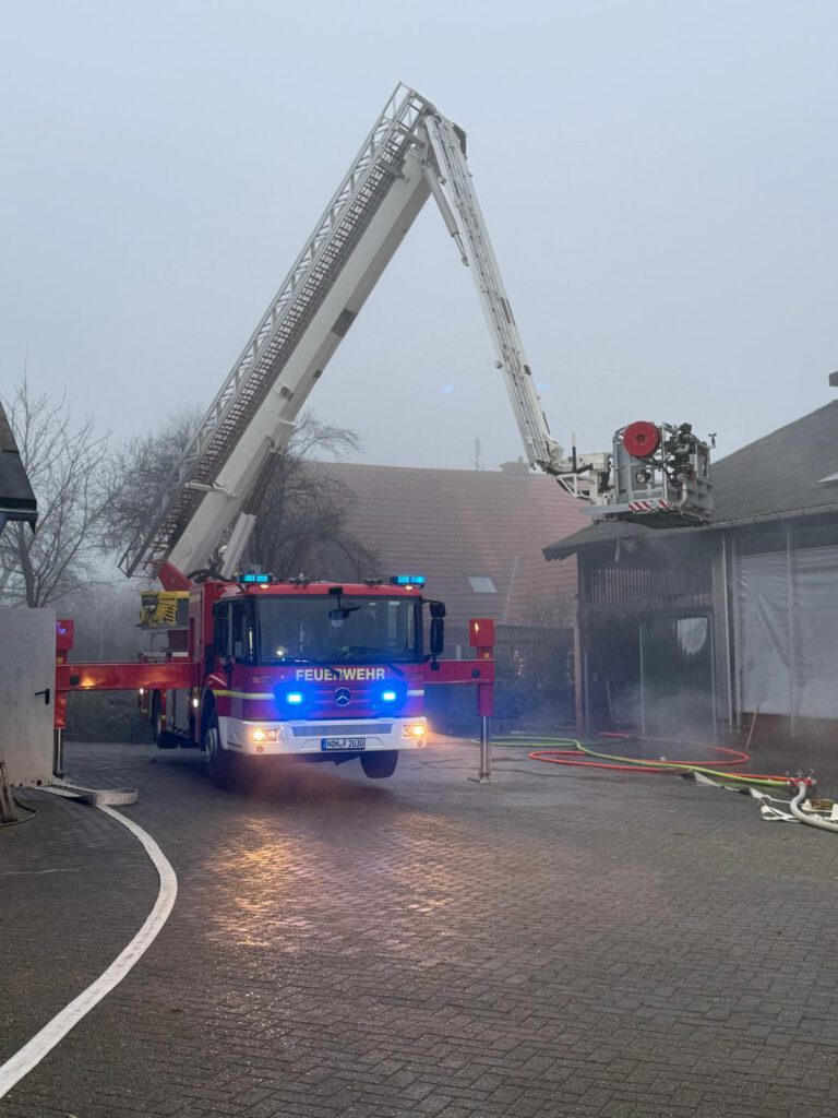 Großalarm am Sonntagnachmittag in Lage. In einem Kälberstall an der Neustadtstraße war aus bislang ungeklärter Ursache ein Feuer ausgebrochen. Der Brand entwickelte sich rasch zu einem Vollbrand des rückwärtigen Stallbereichs. Unmittelbar nach entdecken des Feuers wurde die Feuerwehr alarmiert. Zunächst erfolgte um 15:48 Uhr ein Voralarm, eine Minute später dann die Alarmierung mit dem Stichwort F3 – Gebäudebrand. Bei dem Stichwort wird die Feuerwehr Neuenhaus ebenfalls mitalarmiert.