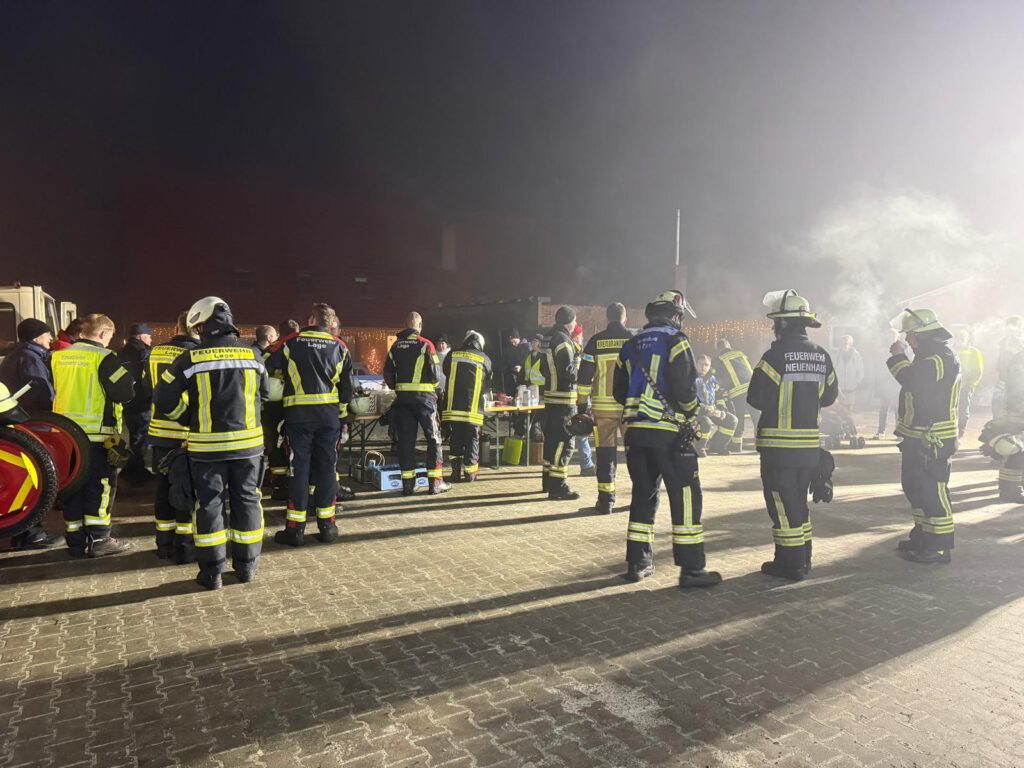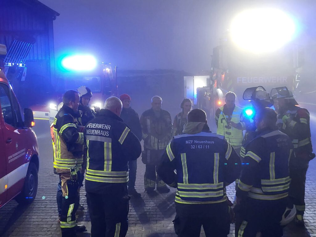 Im weiteren Einsatzverlauf konnte die Feuerwehr Georgsdorf ihre Anfahrt abbrechen, die Feuerwehr Veldhausen rückte von der Einsatzstelle wieder ab. Nach etwa 1,5 Stunden konnte schließlich „Feuer aus“ gemeldet werden. In der Spitze waren rund 100 Einsatzkräfte vor Ort. Insgesamt kamen acht Trupps unter Atemschutz zum Einsatz. Alle Einsatzkräfte konnten sich am Anhänger „Einsatzstellenhygiene“ der Ortsfeuerwehr Neuenhaus umkleiden. Zum Austausch von Gerätschaften und Schläuchen unterstützte ein Mitarbeiter der FTZ Nordhorn mit dem GW-Logistik.